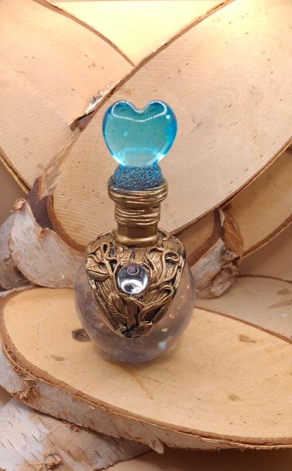 Deze diepblauwe fles straalt kracht en mysterie uit. De maanvormige top en het hart worden omarmd door een rijk gedetailleerd bronzen omhulsel met koninklijke blauwe kristallen.